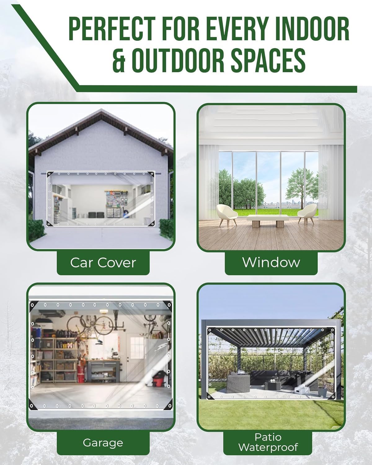 【Heavy-Duty 15 Mil Clear Tarp】Made of tough PVC vinyl, our 15 Mil transparent tarp is designed for long-lasting protection. Each piece is tear-tested, with reinforced corners and metal grommets for maximum durability.