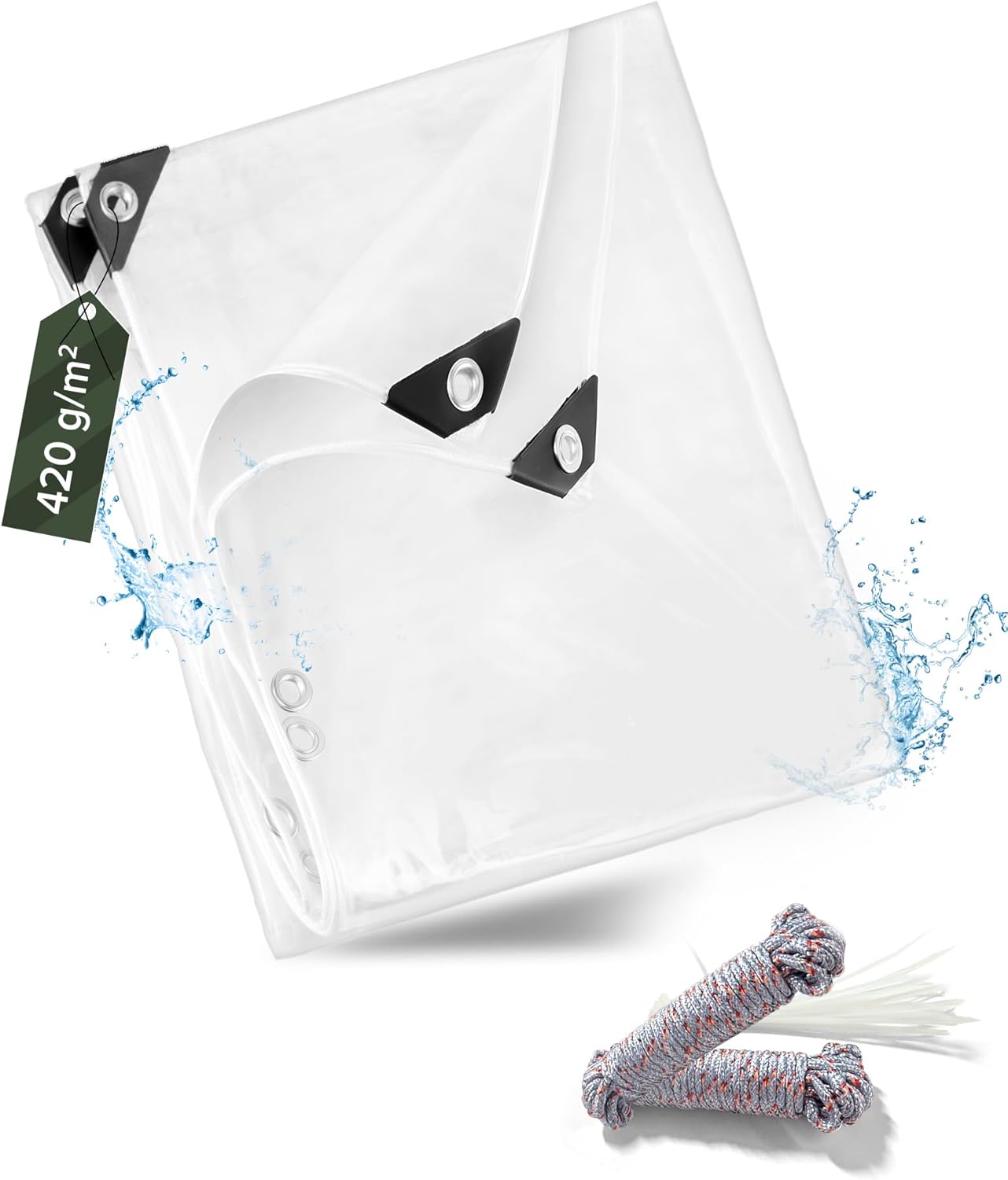 【Heavy-Duty 15 Mil Clear Tarp】Made of tough PVC vinyl, our 15 Mil transparent tarp is designed for long-lasting protection. Each piece is tear-tested, with reinforced corners and metal grommets for maximum durability.